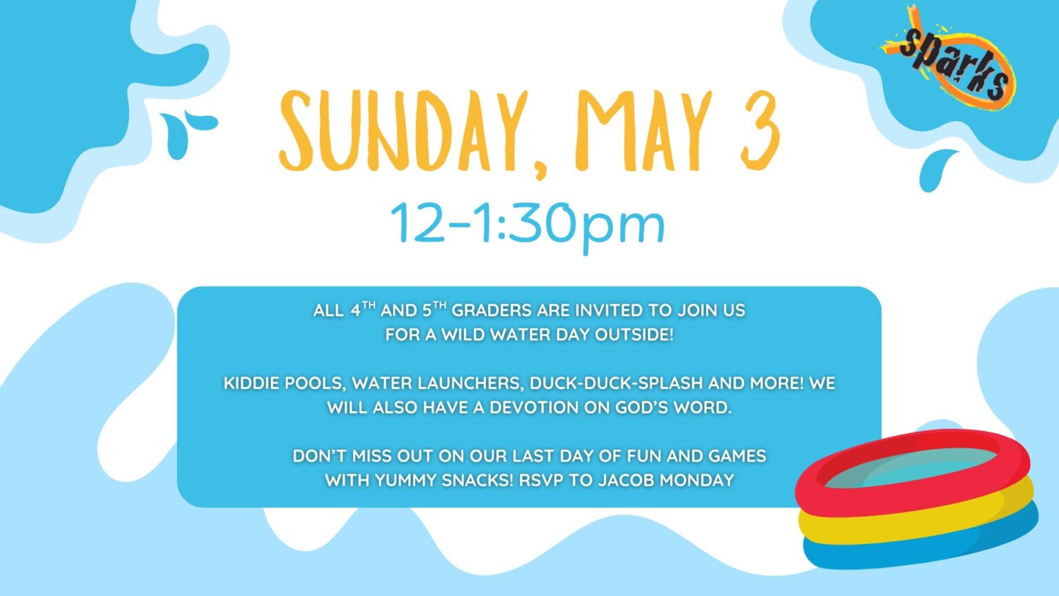 All 4th and 5th graders are invited to Join us for a wild water day outside! Kiddie pools, water launchers, duck-duck-splash and more! We will also have a devotion on God’s Word. Don’t miss out on our last day of fun and games with yummy snacks!